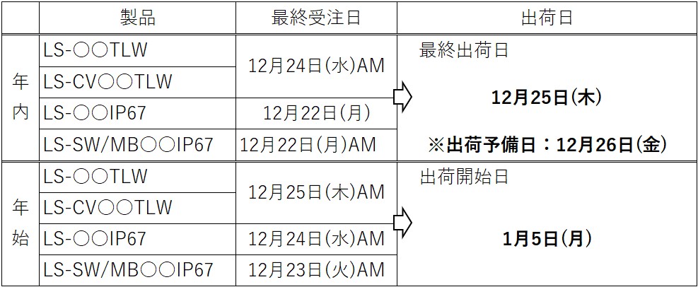 誠に勝手ながら年末年始の出荷スケジュールを以下の通りとさせていただきます。
